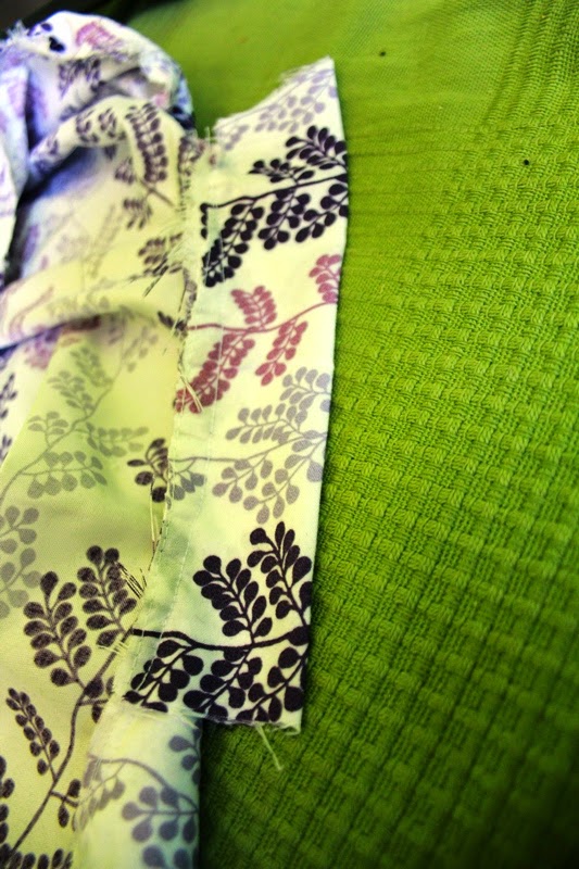 2. Nałożyłam materiał lewą stroną na zamsz (zamszem do środka- u mnie prawa strona zamszu to skórka ;) i przyczepiłam szpilkami, po czym przejechałam maszyną po dwóch bokach. I tak samo z drugimi prostokątami zamszu i zasłony. (należy pamiętać, żeby zamszu było troszeczkę więcej niż bawełny)
